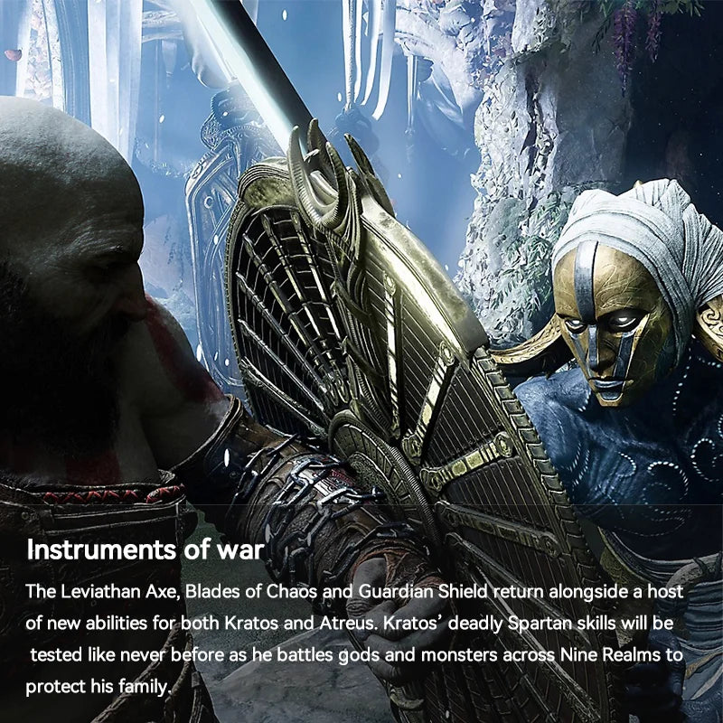 O Machado Leviatã, as Lâminas do Caos e o Escudo Guardião retornam, junto com uma série de novas habilidades para Kratos e Atreus. As habilidades letais de Kratos como espartano serão testadas como nunca antes, enquanto ele enfrenta deuses e monstros pelos Nove Reinos para proteger sua família.