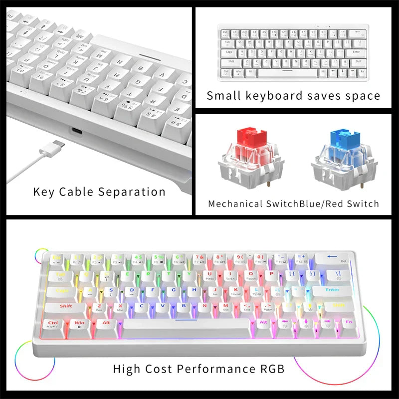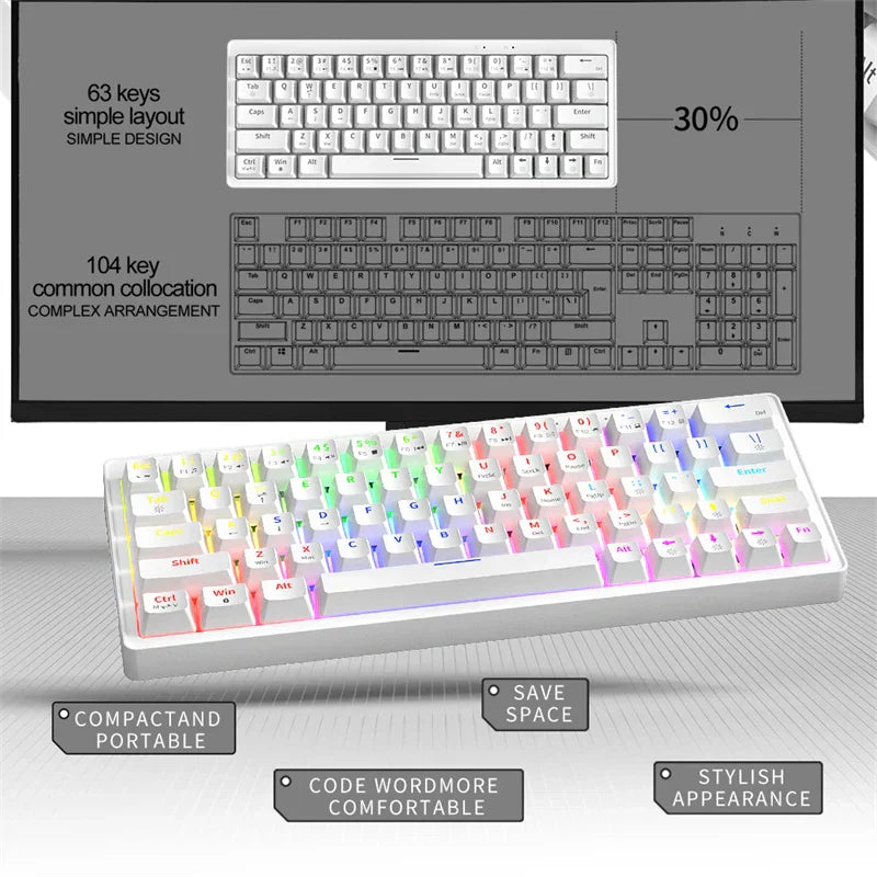 Teclado de 63 Teclas: Layout compacto de 60%, ideal para quem busca um design mais enxuto e portátil, perfeito para gamers e para quem deseja liberar espaço na mesa.